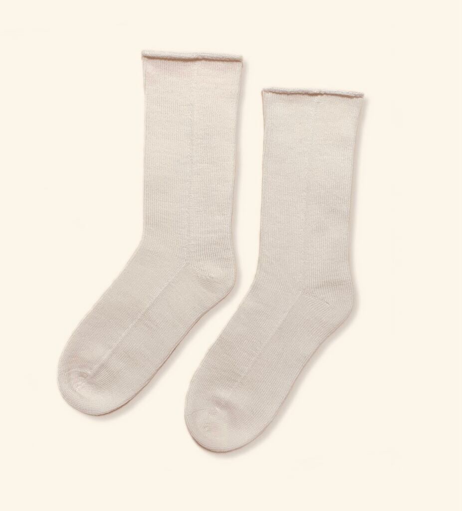 PLA(生分解性プラスチック)とベンベルグで作られたプレーンなソックス。少し光沢があり程よい厚みと柔らかな履きごこち。くるっとロールした履き口がポイントです。ゴムの締め付けが苦手な方にもおすすめです。
